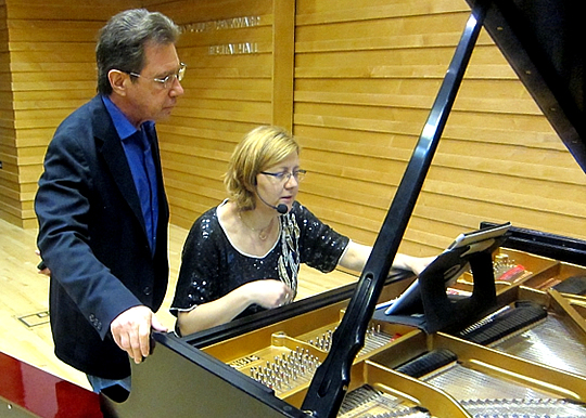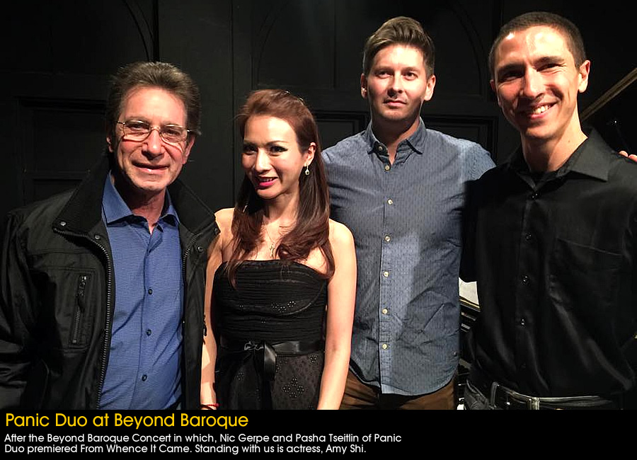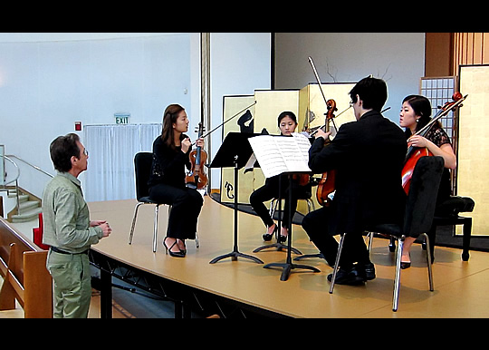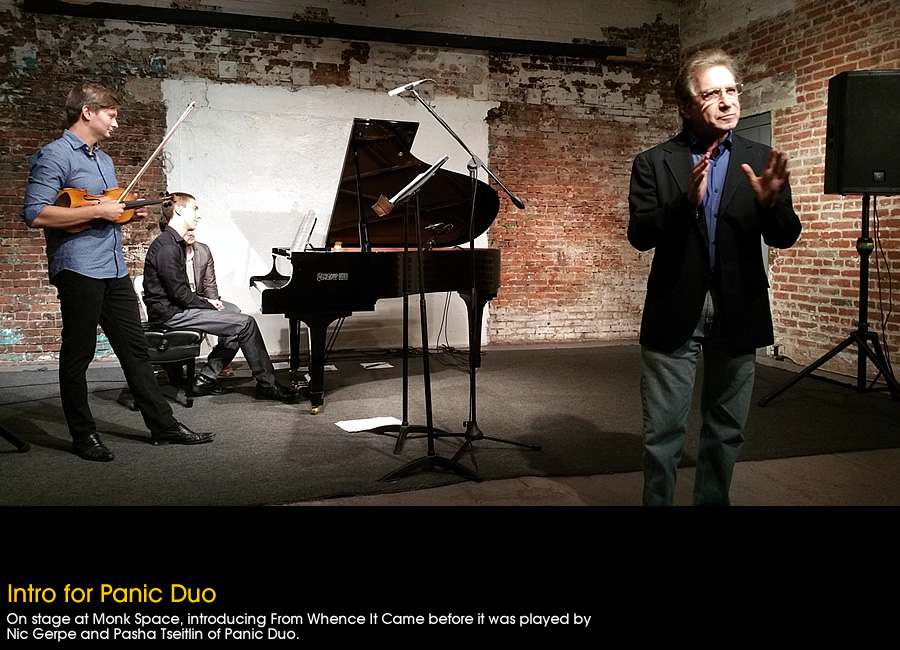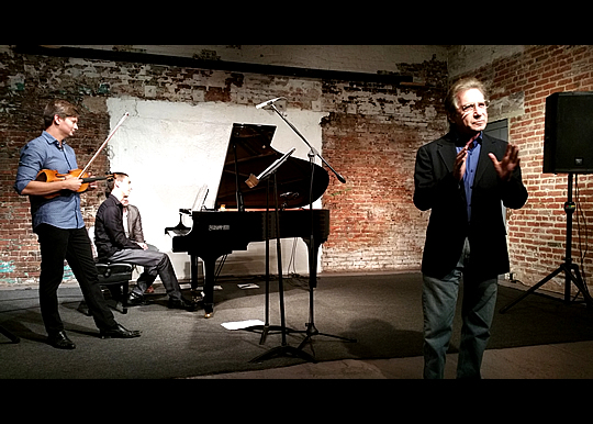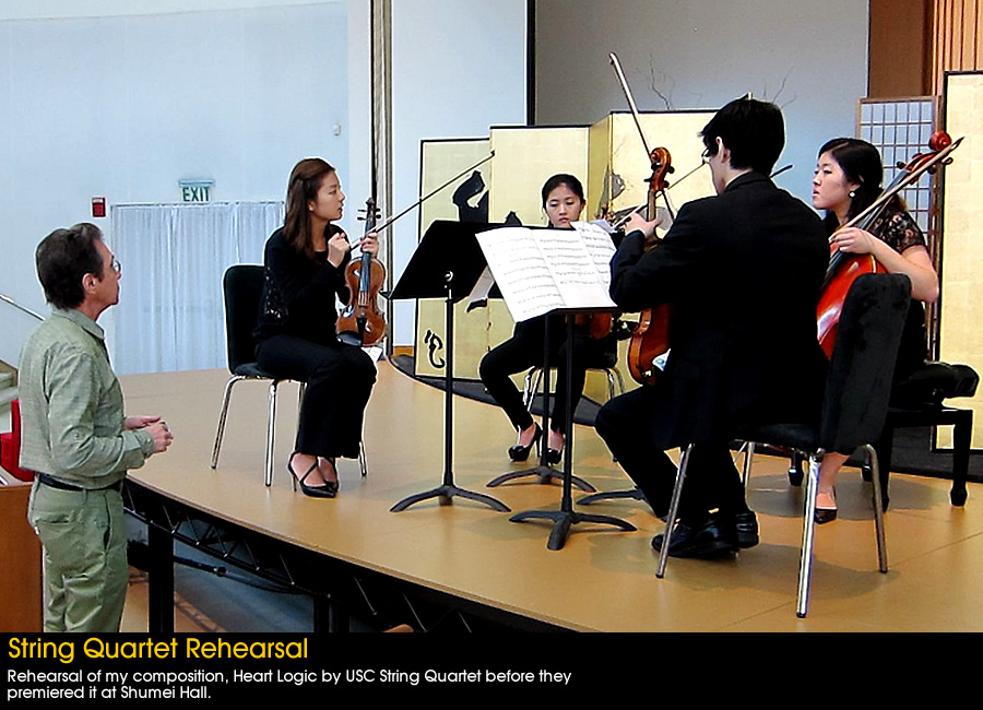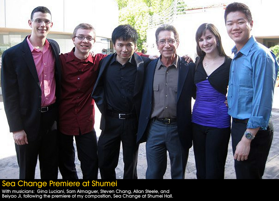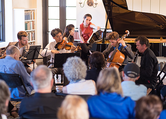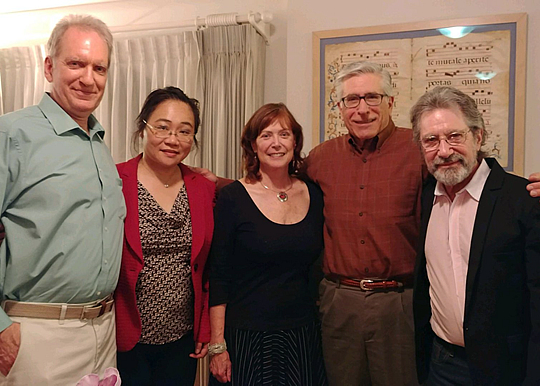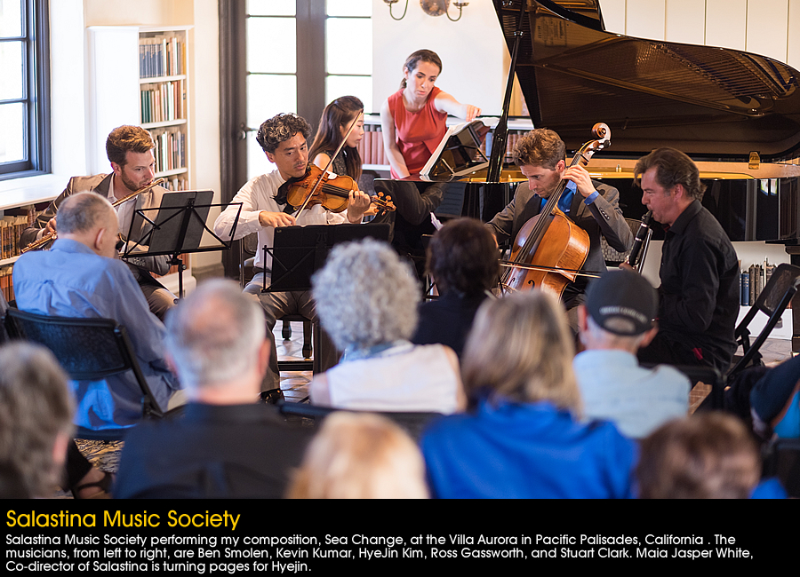 Salastina Music Society performing my composition, Sea Change, at the Villa Aurora in Pacific Palisades, California . The musicians, from left to right, are Ben Smolen, Kevin Kumar, HyeJin Kim, Ross Gassworth, and Stuart Clark. Maia Jasper White, Co-director of Salastina is turning pages for Hyejin.